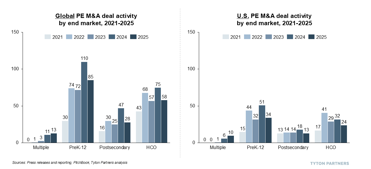 Education did face a unique set of headwinds that exceeded expectations coming into the year. The Trump administration’s aggressive efforts to eliminate the federal Department of Education created uncertainty around funding, regulation, and procurement—particularly in K–12 and higher education (HED). Pandemic stimulus dollars ran out just as inflation lingered, tightening budgets. Meanwhile, enthusiasm for AI was tempered by caution: investors hesitated to back models whose pricing power and defensibility over five-plus year hold periods remain unproven with competing technology that changes so rapidly.
