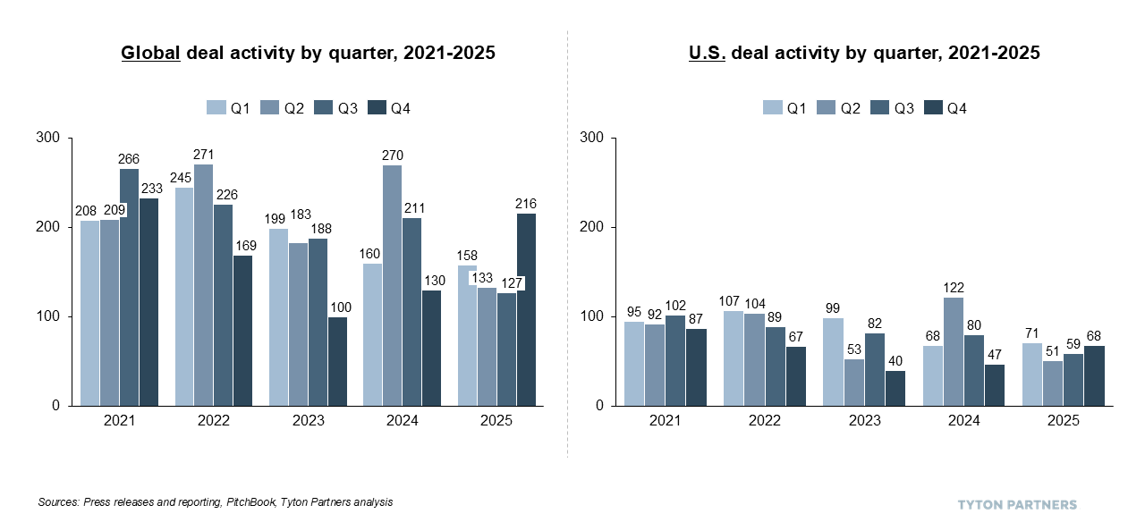 Taken together, 2025 was less a recovery than a reset—forcing sharper discipline on growth assumptions and widening the gap between durable platforms and fragile models. Still, select segments captured outsized investment, which we explore in the following analysis with an eye towards what 2026 will bring.
