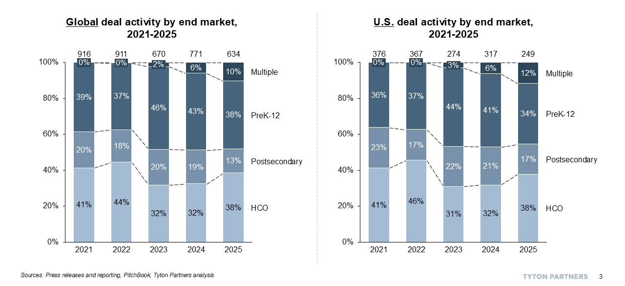 Deal activity declined across most segments in 2025, but the depth of the pullback varied. PreK–12 and Higher Education saw the sharpest contractions, with volume down year over year in both the U.S. (PreK-12: -35%; HED: -37%) and globally (PreK-12: -27%; HED: -41%). In contrast, Human Capital Optimization (HCO) proved comparatively resilient, capturing a larger share of overall activity despite modest absolute declines (-7% U.S., -2% Global).
