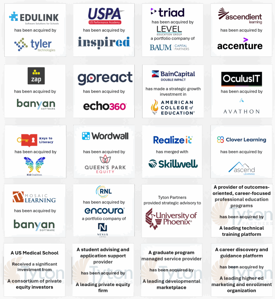 K-12 Transaction SpotlightWe expect K-12 investment to remain robust in instructionally critical, outcomes-oriented segments, particularly where districts are under pressure to show measurable improvement amid constrained resources. Our 2025 K-12 transactions underscore continued demand for solutions that sit close to the core of teaching and learning. We believe literacy, intervention and MTSS, digital curriculum and content platforms, and alternative or flexible delivery models will remain top priorities for districts and investors alike, particularly where solutions demonstrate strong educator adoption and clear impact on student outcomes. At the same time, we see continued emphasis and focus on operational and instructional infrastructure that helps districts do more with less. This includes AI-enabled administrative and back-office tools, data and assessment platforms that simplify decision-making, and systems that integrate cleanly into existing district workflows. Importantly, adoption in K-12 remains pragmatic: districts are prioritizing technology that reduces friction for educators and administrators. As a result, the most attractive K-12 assets in 2026 will be those that combine instructional relevance, operational efficiency, and trusted implementation at scale. Tyton Partners represented the following K-12 education transactions: Edulink, a provider of student data and school administration software, in its sale to Tyler Technologies; U.S. Performance Academy, a flexible and performance-based virtual school operator, in its sale to Inspired Education; Keys to Literacy, a provider of evidence-based literacy training and instructional services, in its sale to K‑12 Coalition; and Wordwall, a digital content creation and engagement platform for teachers, in its sale to Queen’s Park Equity.